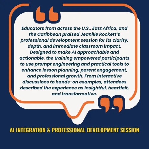 Interactive workshops, keynotes, and multi-session series that help educators, administrators, and district leaders understand and apply AI ethically and effectively in real educational settings.